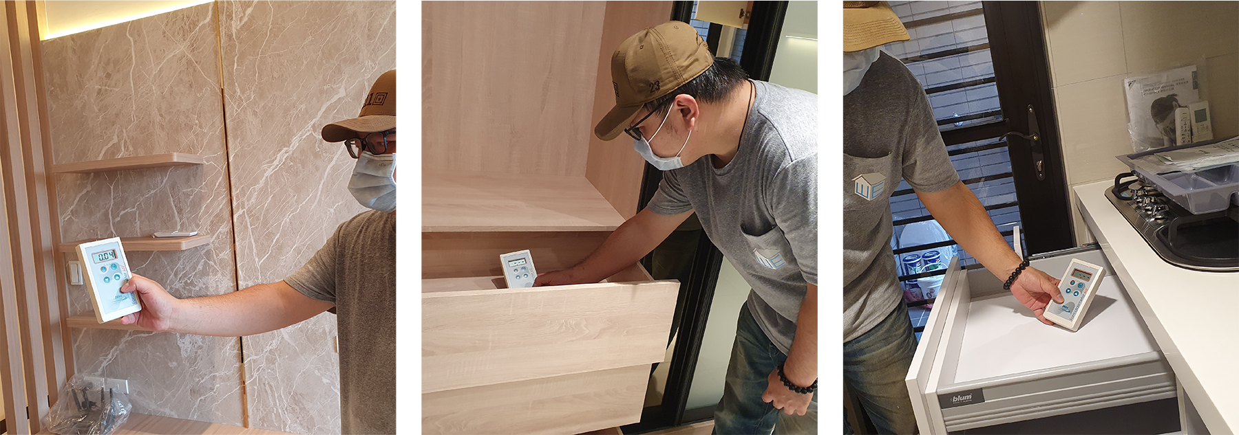 工程結束後,將室內空間、櫥櫃封閉1小時,並與業主會勘紀錄各區淨化後之數據,以此作為完工驗收依據。