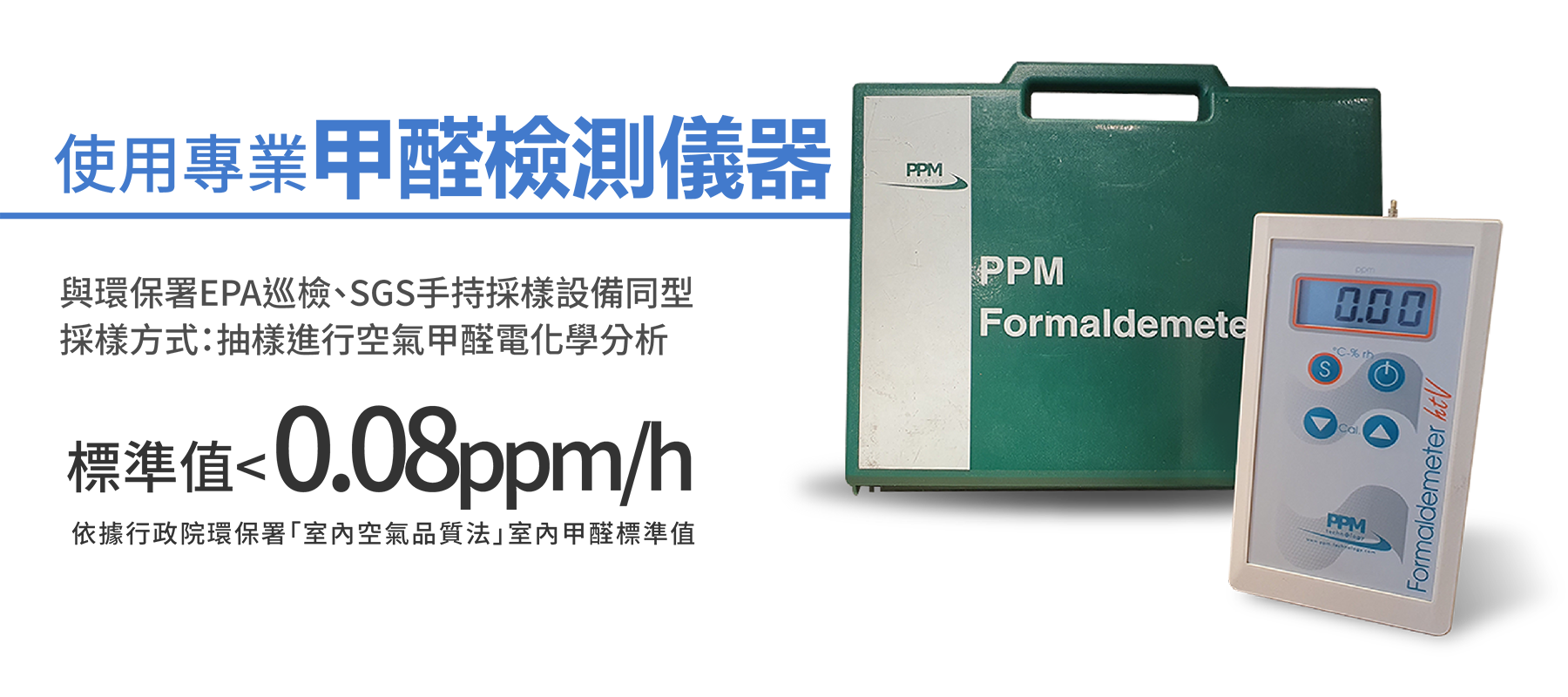 依據行政院環保署「室內空氣品質法」室內甲醛標準值每小時0.08ppm以內