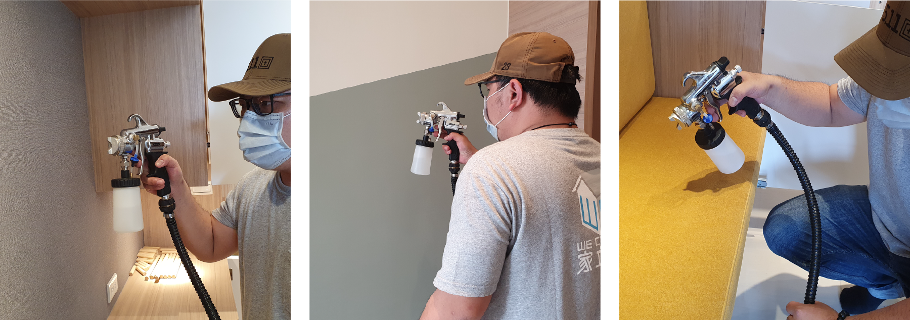 家立淨除甲醛團隊於施工前會將業主之各項3C產品或貴重物品先行保護後再開始進行甲醛清除工作。以專利配方之幾丁聚醣+生物酶為原料,將所有櫃體、層板、抽屜、門片等等均勻塗抹一層防護層,能有效吸附分解甲醛,專利奈米配方不含有毒物質等重金屬,帶有大量的負電荷,並形成強大的吸附力,能迅速分解游離甲醛、細菌、病毒及有害物質,達到防霉抗菌的效果,並有效防止病菌滋生,淨化環境品質。